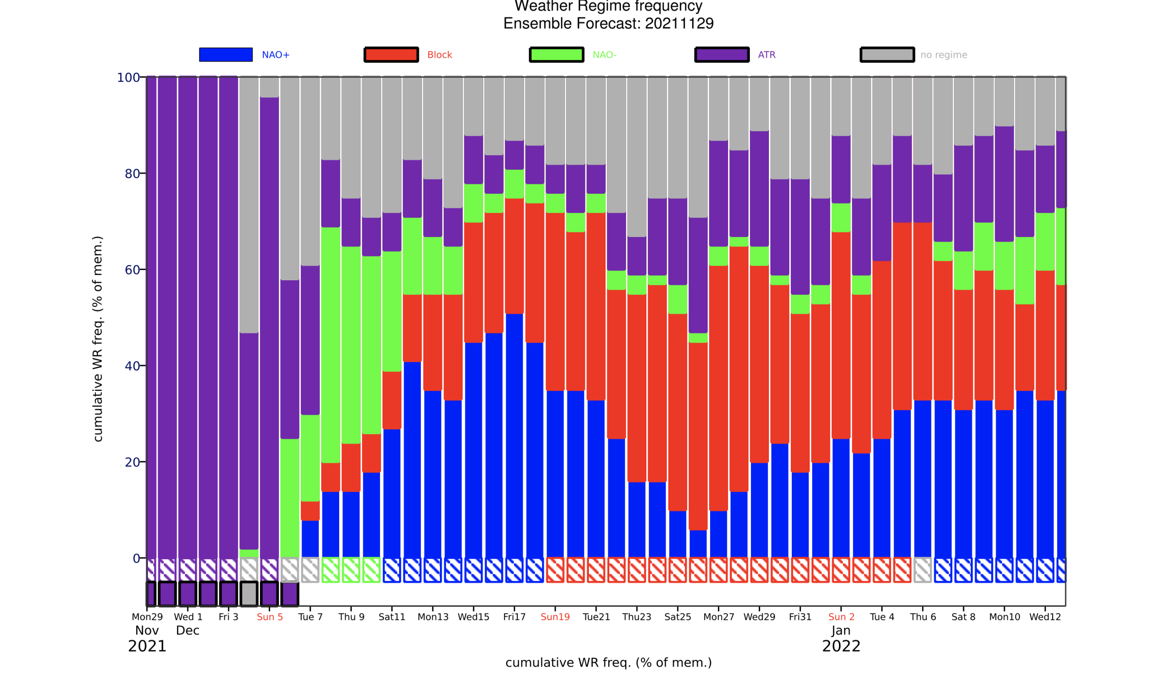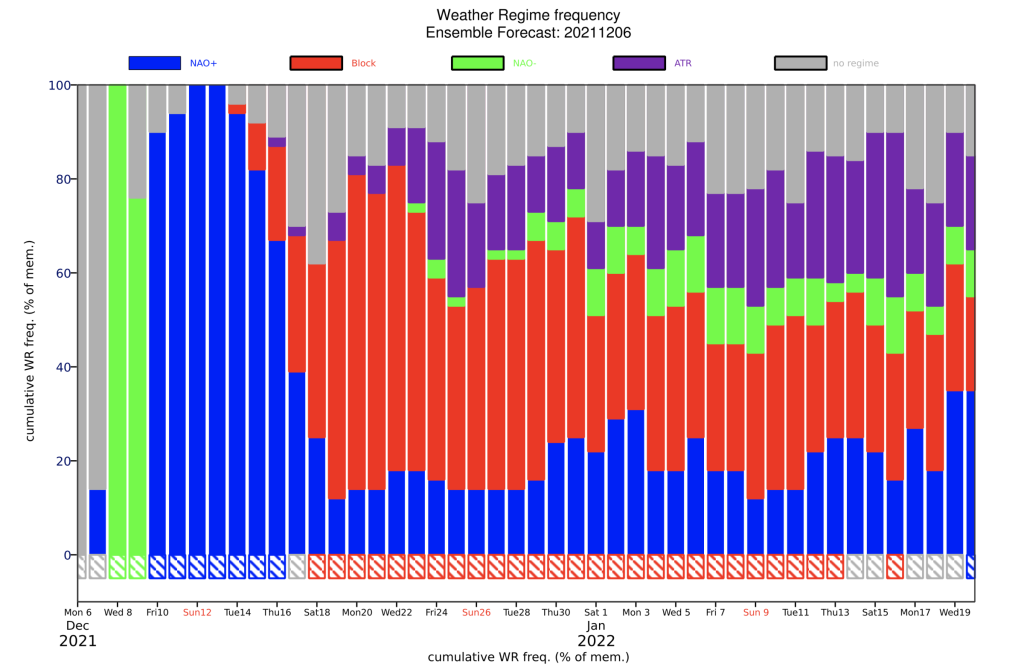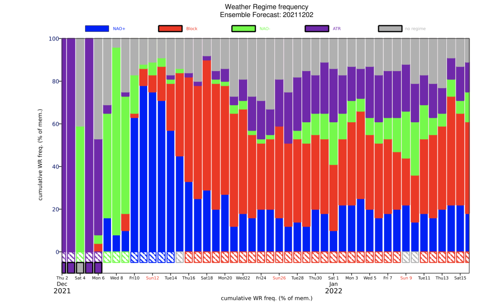 Deze twee grafieken zeggen daar veel over. Je ziet de NAO+ (blauw) snel afgebouwd worden, en 'vervangen' worden door een Scandi-hoog (rood). Duidelijk sneller dan eerdere berekeningen. Onderaan de vorige berekening(van 02-12) en die daarvoor, van 29-11.
