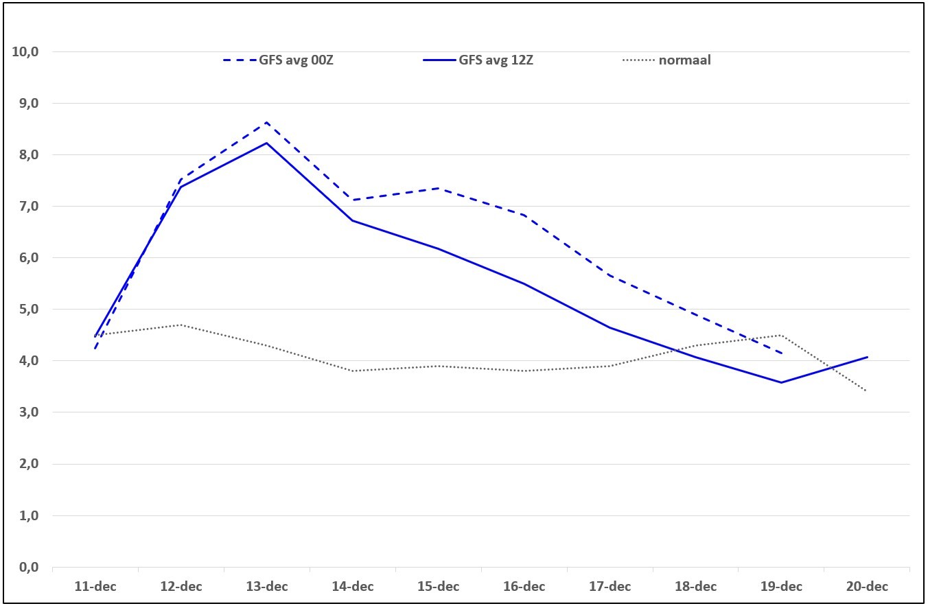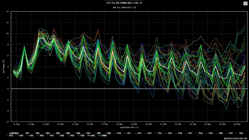 GFS ensemble. Zacht, later normaal. LT afgekoeld.