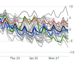Zie afbeelding. Hier schommelt het gemiddelde (zwarte lijn, is dus niet de mediaan) rond het vriespunt maar is ook duidelijk te zien dat alleen de koudste members op -5 graden of iets lager uitkomen, dus zeggen dan 70% van de berekeningen op -5 tot -8 graden uitkomen in de nacht, is ook op basis van deze pluim een bewering die ver van de waarheid afstaat.