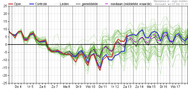 Vergelijk je de pluim van vandaag met die van drie volle dagen voor zondag 7 februari van dit jaar, dan zie je dat de temperaturen toen al wel iets lager waren in de pluim en de onzekerheid iets minder groot was. Desondanks zou het nog prima kunnen dat als de onzekerheid wat meer weggepoetst wordt in de pluim, we richting een februari 2021 pluim zouden kunnen gaan. Afwachten. Ik blijf voorlopig flink positief.