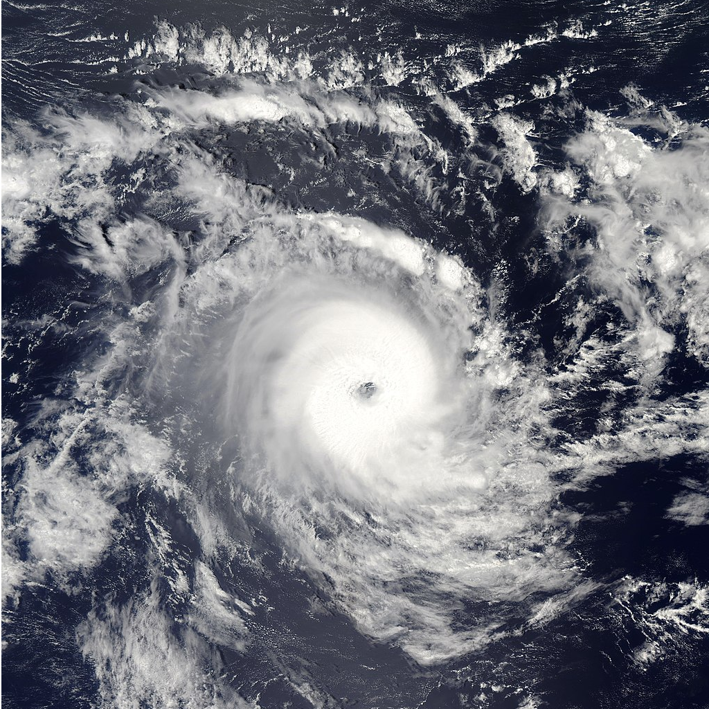 De twee sterkste stormen bleven gelukkig wel ver van land en waren zo mooie natuurverschijnselen om van een afstand te bestuderen. Faraji (zie afbeelding hieronder) ontstond ver ten oosten van Madagascar en sterkte snel aan tot een cat 4. Vervolgens zwakte de storm echter weer af door upwelling, een proces waarbij kouder zeewater vanuit de diepere oceaan naar boven komt en de storm afzwakt. Dit gebeurt vaak met cyclonen die lang op dezelfde plek blijven aangezien ze na een tijdje alle warmte uit het oppervlaktewater zuigen. Toen Faraji vervolgens verder naar het oosten dreef, kwam het weer in een gebied met hogere zeewatertemperaturen en bereikte de storm z'n definitieve piek als een categorie 5 cycloon. Kort daarna zwakte de cycloon weer snel af doordat windstromingen de outflow ('uitstroom') van de storm beperkten. Outflow is de wind die van een storm wegblaast in een soort ringvormige structuren. In de meest extreme stormen is dit soms te zien in de vorm van 'gravity waves' wat echt geweldig is om te zien, zie bijvoorbeeld de afbeelding van Sam in deel 1 van dit overzicht. Hoe dan ook, als deze outflow aan één zijde wordt beperkt dan verdwijnt de symmetrie van de storm. Een 'pinhole' categorie 5, dus een storm met een heel klein oog, is bijzonder fragiel en door de outflow problemen stortte het oog in elkaar en zwakte Faraji snel af. Een maand later ontstond categorie 4 cycloon Habana in dezelfde regio. De evolutie van Habana is ook interessant en had net als Faraji twee pieken. De eerste piek werd beëindigd door outflow problemen die ervoor zorgde dat droge lucht in de kern van de storm kon komen. Droge lucht is de kryptonite van tropische stormen dus als dat soort lucht in de kern komt dan kan dat de hele cycloonfabriek, om het zo maar te zeggen, stilleggen. Als een categorie 1 cycloon kon Habana daarna weer stabiliseren en sterkte de storm opnieuw aan. Tijdens deze tweede aansterking was er ook een zogenaamde eyewall replacement cycle, die ik ook al een aantal keer eerder in dit bericht benoemde. Hierbij wordt een van de windbanden zo sterk dat hij begint te domineren over de binnenste eyewall. Die eyewall wordt dan leeggezogen van z'n vochtige lucht en verdwijnt waardoor die dominante windband de nieuwe eyewall wordt. Het oog wordt hierdoor dus een stuk groter net als het windveld, maar de storm zwakt wel (tijdelijk) af aangezien we natuurlijk iets hebben als een wet van impulsmoment wat betekent dat een groter ding met dezelfde energie langzamer draait kan een klein ding. Na de EWRC bereikte Habana de tweede piek als een cat 4 en begon een annular vorm te krijgen. Enkele dagen later zorgde hogere wind shear en minder vochtige lucht echter voor het definitieve einde van Habana.