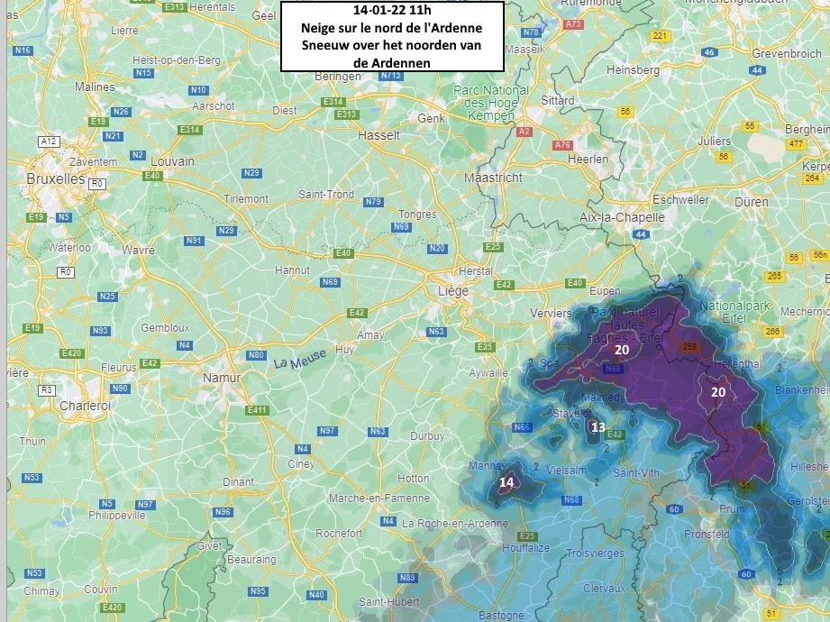 Het sneeuwdek bereikt 1 tot 4 cm boven 450 m, 5 tot 14 cm boven 550 m en 14 tot 20 cm boven 650 m