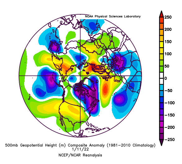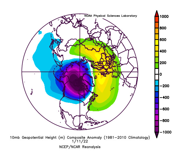Ik begin met de kaarten van 1-11 januari, 10 hPa en 500 hPa. We kunnen hieruit aflezen dat de stratosfeer in grote lijnen de stromingspatronen in de troposfeer (500 hPa) dicteert, met een koudepoel boven Noordoost-Canada en een zone van hogedruk centraal in de noordelijke Atlantische Oceaan (