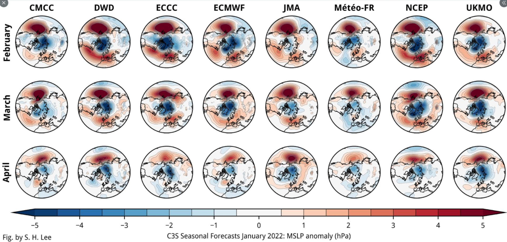 Ondertussen dient zich de vraag op of het nog wat wordt met de winter, in de laatste maand. Twee manieren om ernaar te kijken (of helemaal niet kijken, staat ieder vrij): teleconnecties of seizoensmodellen. Om met de laatste te beginnen: kansloos (zie laatste plaatje, met dank aan Sebastiaan) dat we nog iets van winterweer gaan meemaken, een paar nachtvorstjes hoogstens. Ook de EC46 is volstrekt uitzichtsloos. Blijven de teleconnecties. De enig relevante die ik ken zijn de PDO (nogmaals) en de La Nina. Dit koppel samen hebben we in eerdere berichten verantwoordelijk gesteld voor het falen van de winterverwachting bij de wintermeeting. Ook voor februari biedt dit koppel geen uitzicht op verandering ten goede: meer hogedruk over de gordel die hierboven omschreven is. Aan de andere kant: de extreem negatieve PDO van december biedt wel hoop op een omslag in februari. lichte voorkeur hogedruk boven Groenland. Daar komt bij dat de oostelijke La Nina, zoals deze nu heerst, ook in die richting werkt. Het WCS stelde kort geleden nog vast dat de negatieve PDO van december op een omslag voor februari, maart en april zou kunnen leiden, maar stel dat het maart of april wordt dan hebben we daar natuurlijk weinig meer aan.