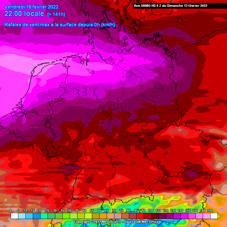 UKMO: 100 tot 150 km/h landinwaarts, in het noorden tot 160 tot 180 km/h.