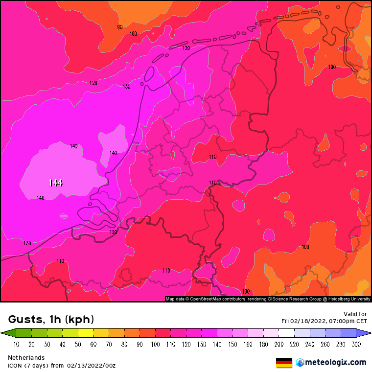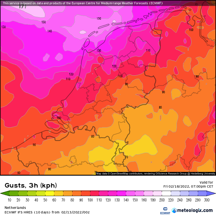 ECMWF: 70 tot 100 km/h landinwaarts, op de Wadden tot 160 km/h.