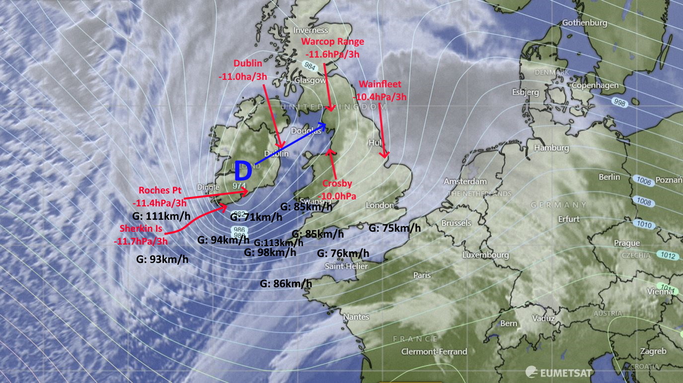De stormdepressie "Eunice" die vanmorgen haar centrum over Zuid-Ierland heeft zal gedurende deze vrijdag verder naar het noorden van Engeland en de Noordzee trekken.