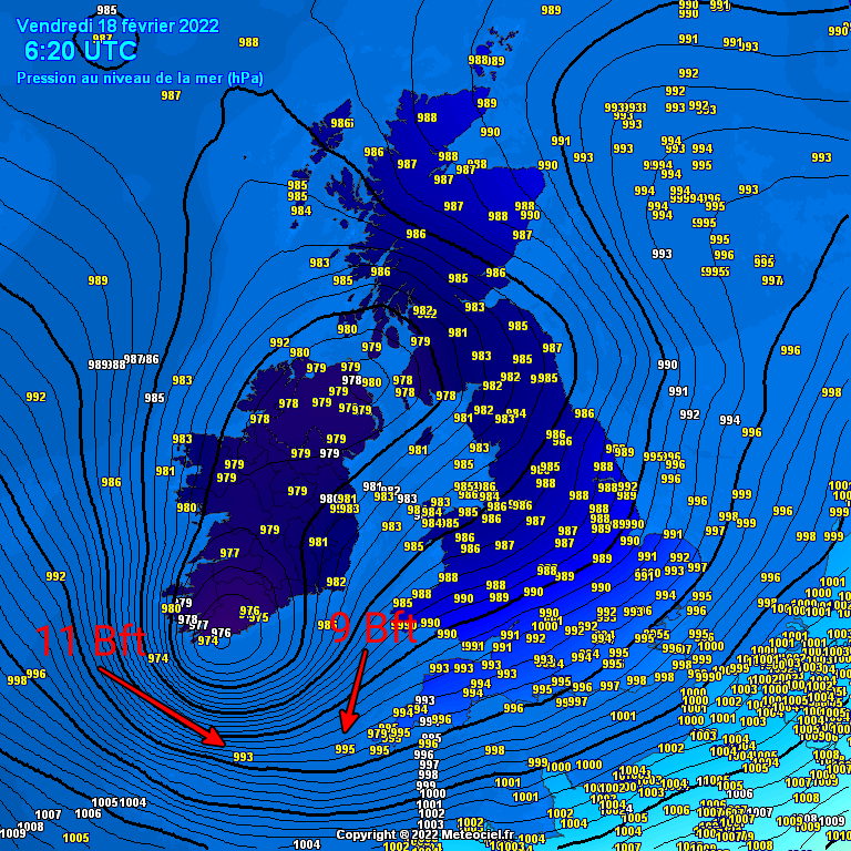 11 Bft (zeer zware storm) inmiddels ten zuiden van Ierland.