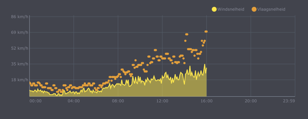 Vaassen net de eerste vlaag boven 70 km/u, 10min gem 5 Bft