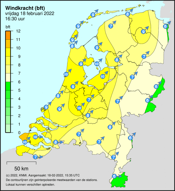 Houtribdijk, Wijk aan Zee, Vlissingen en Wilhelminadorp zitten dicht tegen 11 Bft aan.