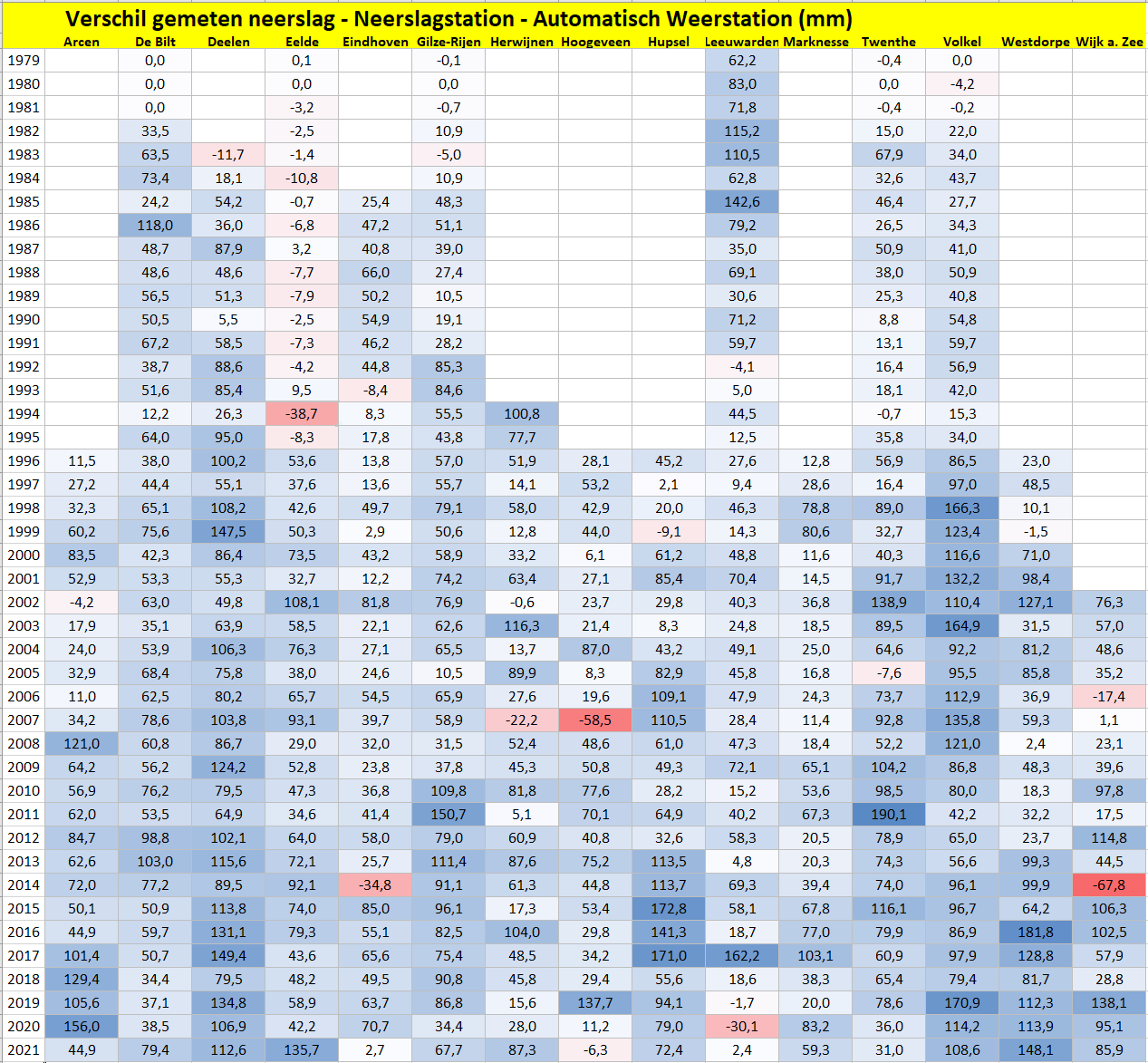 Het verschil kan oplopen tot meer dan 100 mm per jaar, met uitschieters tot 190 mm in een jaar (Twenthe 2011). Op het neerslagstation Twenthe werd toen 838,9 mm neerslag gemeten, en op het AWS station slechts 648,8 mm.