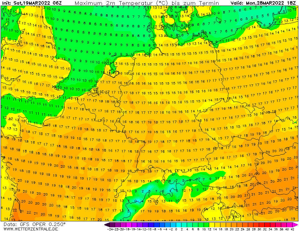 Morgen nog wat bewolking en een enkele bui, maar vanaf maandag een week lang stralend zonnig, droog en warm lenteweer. De temperaturen zouden dagelijks kunnen oplopen naar 15 - 20 graden, wat beduidend zachter is dan de 11 à 12 graden die normaal is voor de tijd van het jaar.