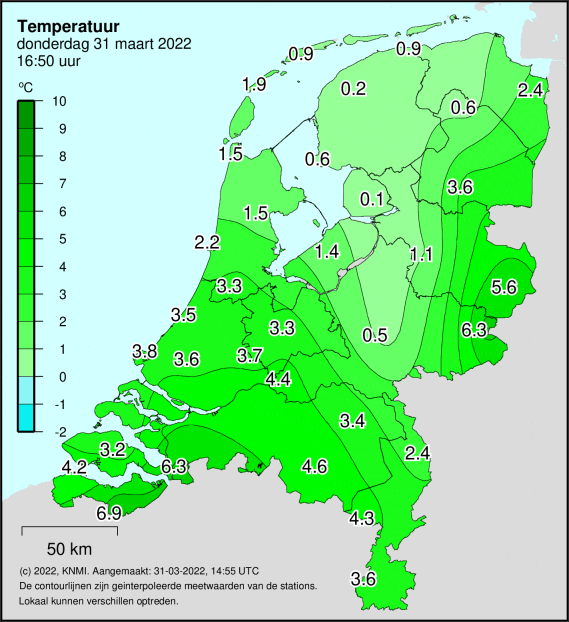 Te Deelen zal het hard sneeuwen gezien de verder dalende temperatuur en ingesneeuwd webcam langs de A50. Warme sector in het oosten inderdaad en ook te Nieuw Beerta stijgt de temperatuur weer wat