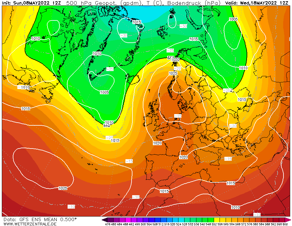 Allebei een krachtig hoog net ten (noord)oosten van ons en een grote trog op de Atlantische Oceaan. Dan zit je al snel in de warme lucht.