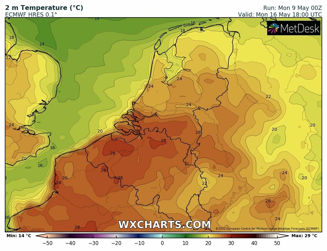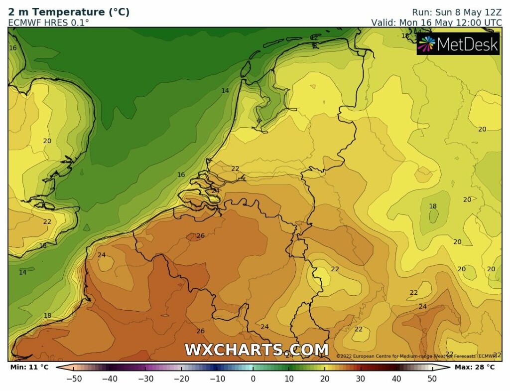 We zitten deze run wel nóg meer in de warme lucht door de wat oostelijkere ligging. Gisterenavond (12z) werd nog 20 - 26 graden berekend voor maandag 14h, nu is dat 23 - 29 graden.
