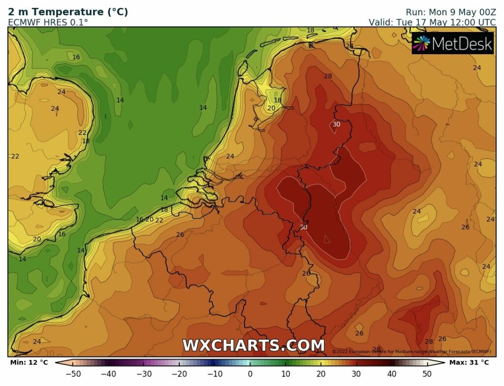 Dinsdag lokaal 31°C om 14:00 's middags.