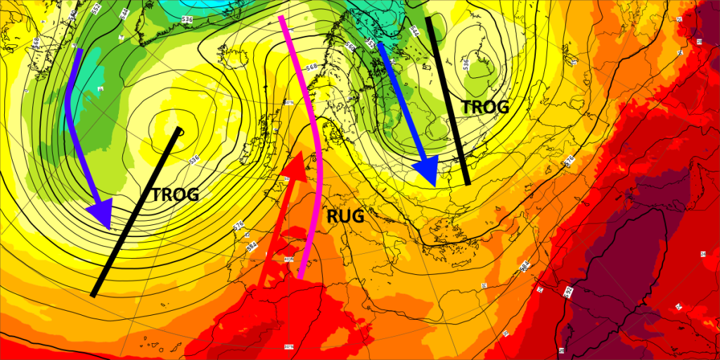 Omega-blokkade in de steigers. De straalstroom volgt een omleiding via Groenland en Lapland. Zeer sterke meandering. Met een diep uitzakkende hoogtetrog op de Oceaan en de opbouw van een ferme rug net ten oosten ligt de weg vrij voor zeer warme lucht vanuit het zuiden. Enige manier waarop dit doorbroken kan worden is het verder opstomen van de trog vanaf de Oceaan. Gebeurt tot +240 onvoldoende, maar sluit het later niet uit. Rug bouwt namelijk best oostelijk op.