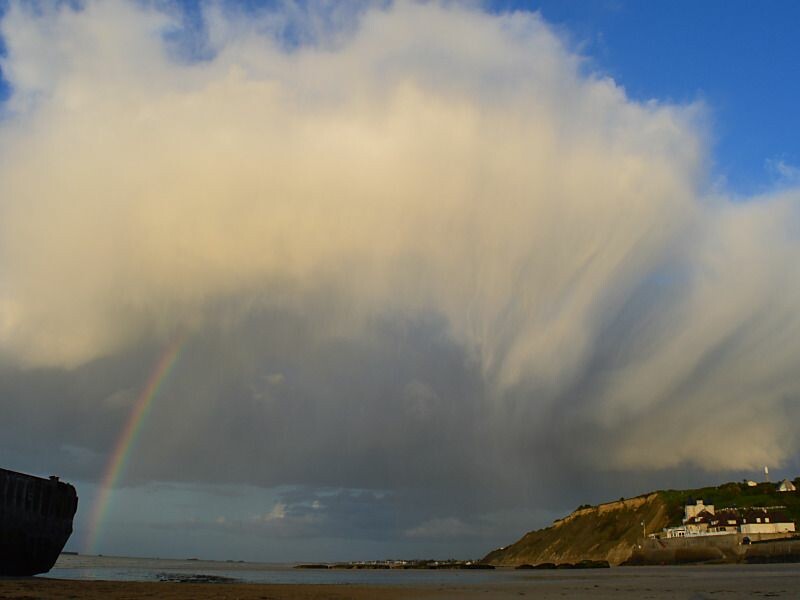 Mooi. Ik moest terugdenken aan een foto die ik op de invasiestranden in Normandië, Arromanches maakte een aantal jaar geleden. Een indrukwekkende plek waar dan zo'n magisch moment ontstaat met een regenboog.