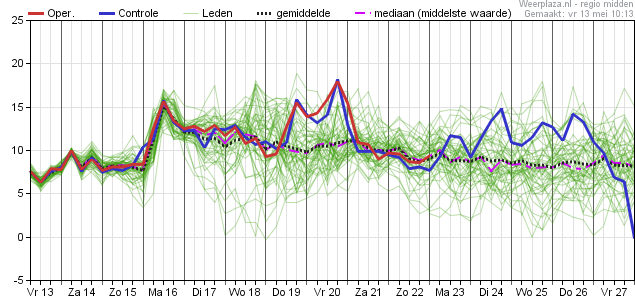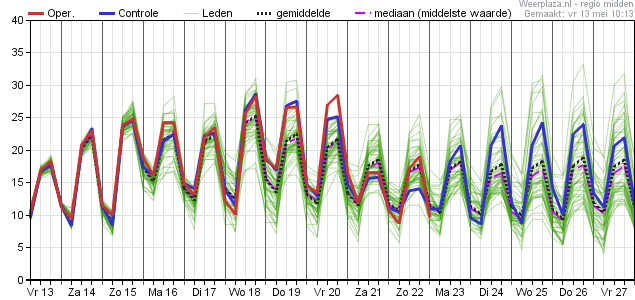 . Op de LT stijgt het gemiddelde naar ongeveer 25 Gr Celsius op maandag. Daarna ligt de oper een paar dagen bovenin, met donderdag en vrijdag opnieuw hoge dauwpunten bij de oper. Op de grens met de zeer warme en vochtige lucht, de daarbij horende neerslagkans (onweersachtig). Blijft onzeker wat het precies wordt vanaf maandag.