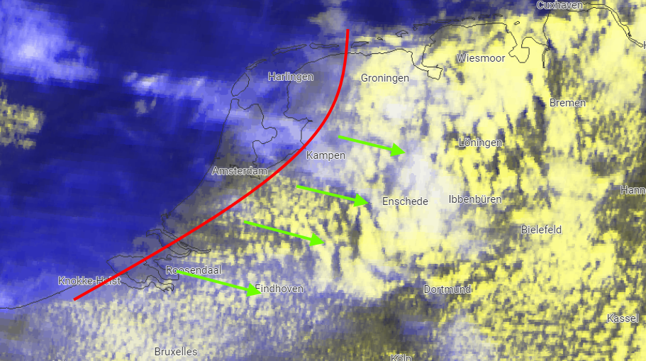 De Sc-velden zijn in Duitsland nog groter en dikker, koudere bovenluchten daar. Daar vallen zelfs kleine buitjes doordat de Sc-laag dik genoeg is en toppen in het ijs zitten. Zou in het uiterste oosten van Groningen ook kunnen gebeuren nu. De rugas van het hoog boven Frankrijk komt echter steeds dichterbij, waardoor de subsidentie toeneemt. De Sc landinwaarts gaat dan over in kleine Cu en lost uiteindelijk ook steeds dieper landinwaarts op. In het NO duurt dit het langst, bovenluchten daar langer koud.