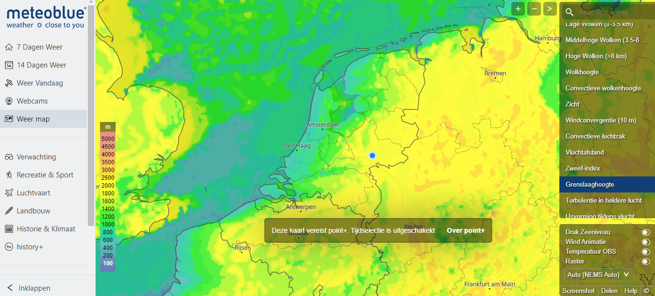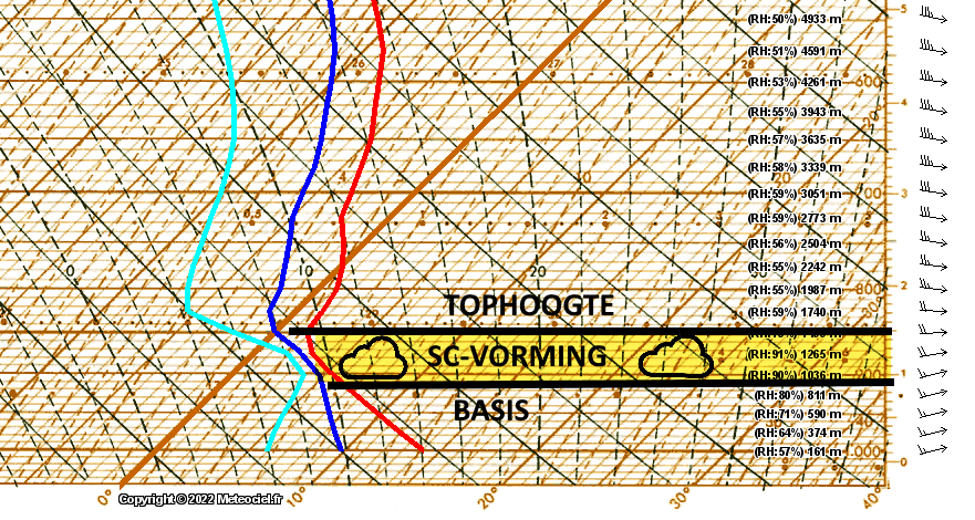 Is goed te zien op de satellietbeelden. In het westen vanwege binnenstromen koele zeelucht een lage grenslaaghoogte. Vanaf 20-30km landinwaarts vorming van Cu die zich oostwaarts steeds verder uitspreiden onder een subsidentie-inversie op circa 1500 meter hoogte. Dit zorgt voor de vorming van Sc-velden. Vliegveld Weeze (niet ver van jou, Wim) geeft de basis van de bewolking nu op 3000ft, komt goed overeen met de sounding van WRF voor dit tijdstip die de basis ook net iets onder de 1000 meter heeft.