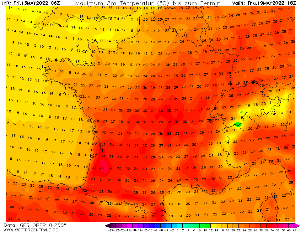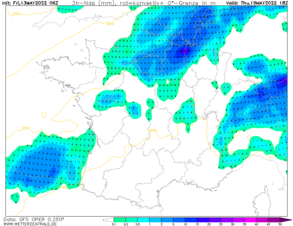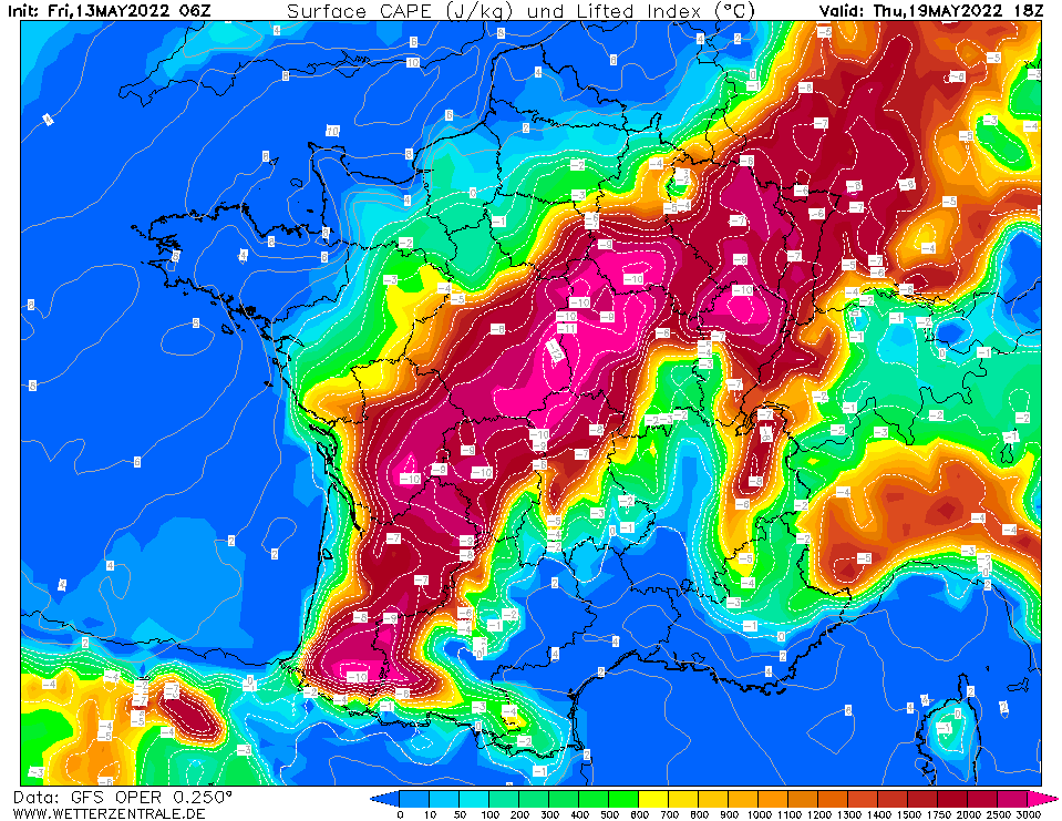 GFS komt met de eerste potentiele zware onweerssetting op 156u (volgende week donderdag) voor FR en zuiden van de Benelux. Even schetsen: overdag ruime tropische temps over centraal FR dat later op de dag aanzet tot capewaarden boven 3000j/kg en lokale lifted index tot -12! Shear lijkt bovendien ook gunstig te zijn. Neerslag wordt eerst aan de grens met iets minder hete lucht berekend met onweders boven N-FR en zuiden van de Benelux rond 18z en later rond 00z in het zwaarste cape veld boven centraal FR. GFS, je hebt nog een week tijd om het iets noordelijker te berekenen