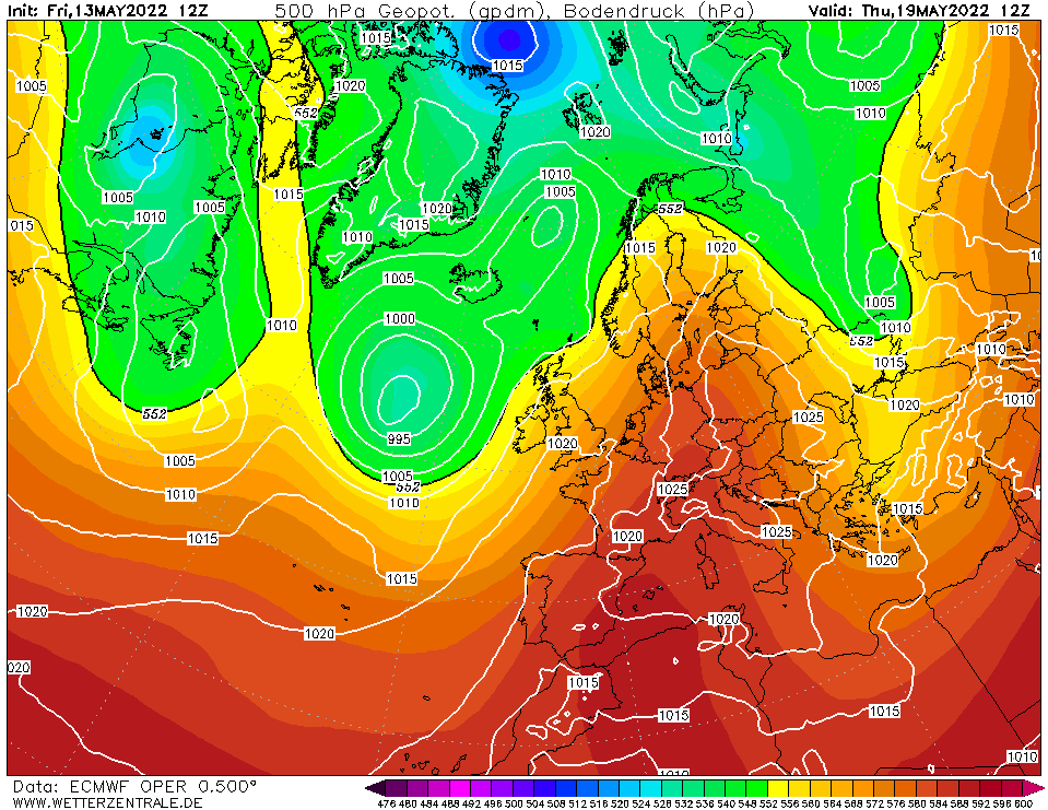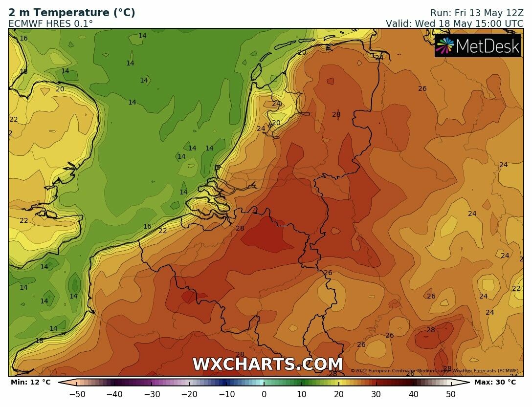 EC Oper 12Z. Woensdag en donderdag lijken de warmste dagen te worden