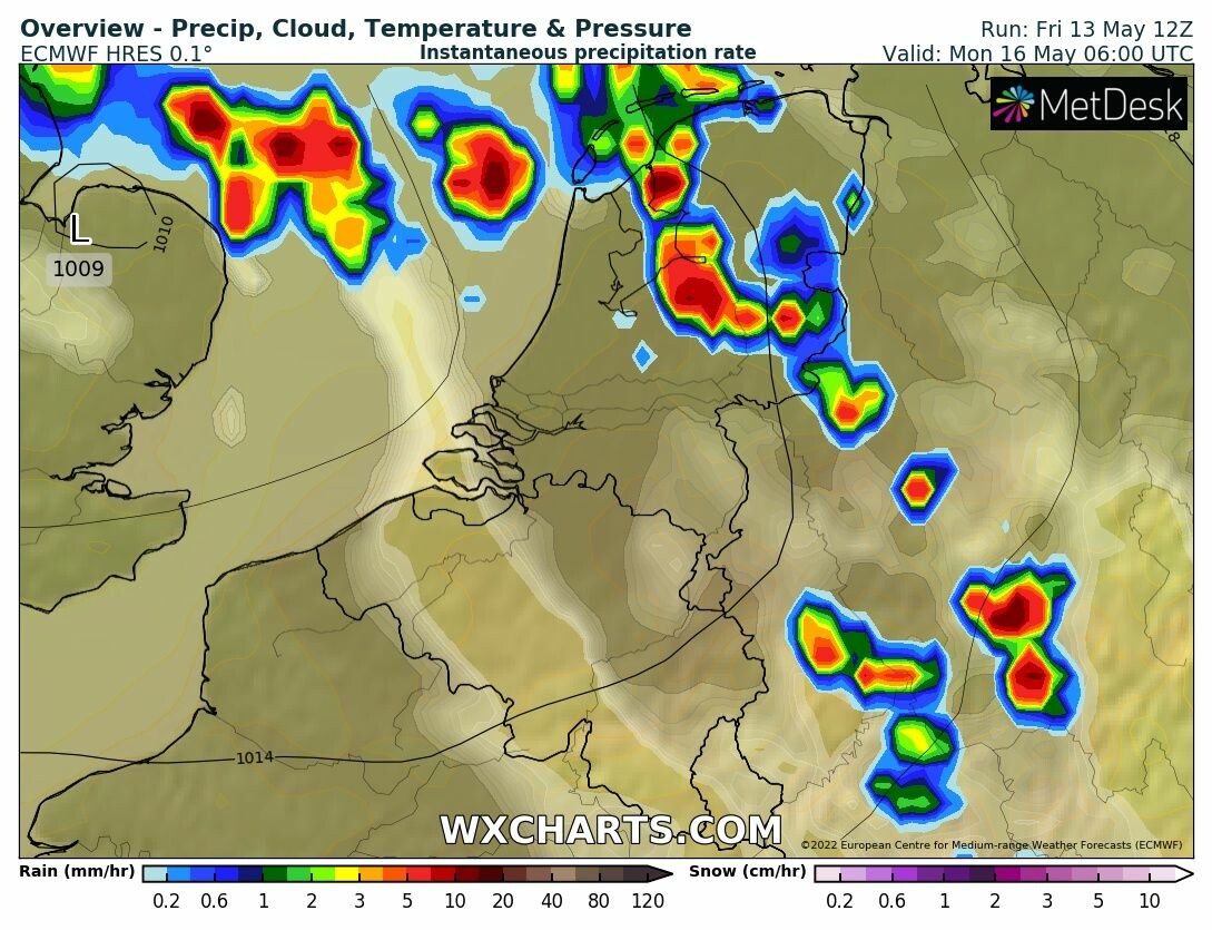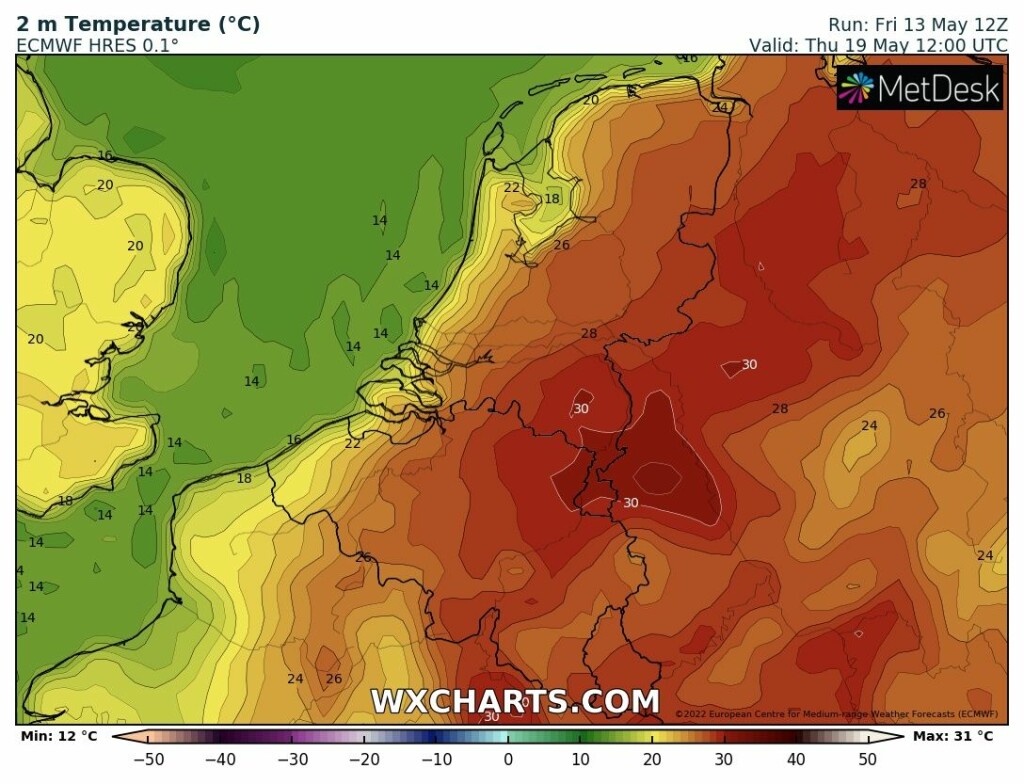 donderdag onweerslaag over het oosten en hier wind van zee. Niet goed.
