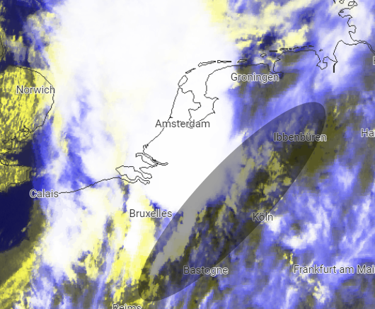 Voor de squall op het KF uit in de warme lucht in het oosten is de convectietemp bereikt (T 27-30) en in heldere lucht wordt energie vanaf de grond benut. Dit zijn in potentie de cellen met de meeste randverschijnselen. Zie bijv. die bui west van Luik.