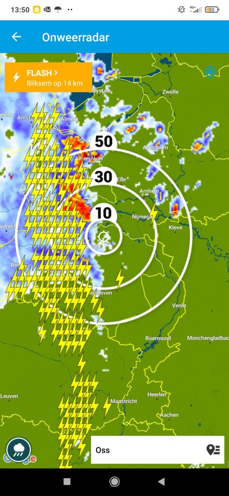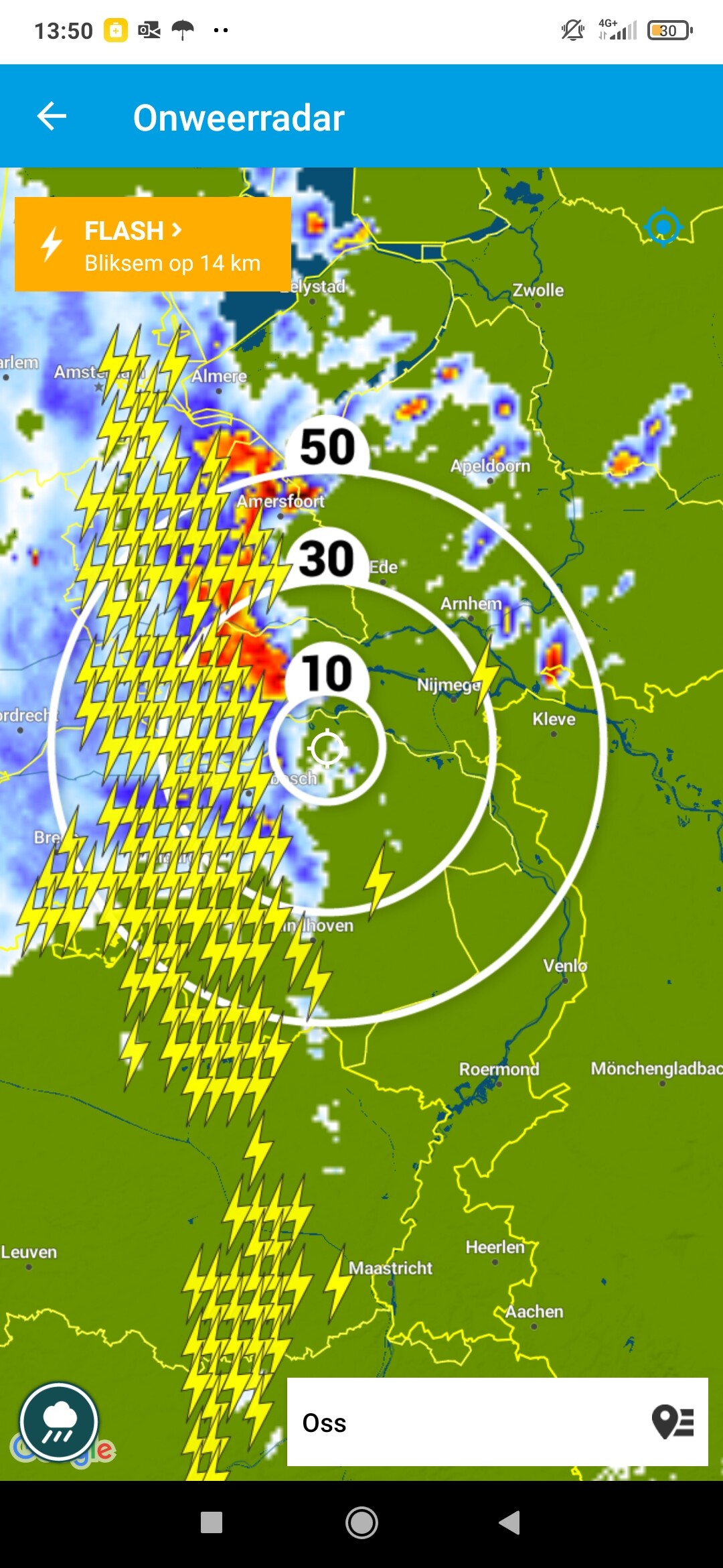 Te zien aan de vele bliksem icoontjes. Moet wel zwaarder zijn dan de radarbeelden aangeven.