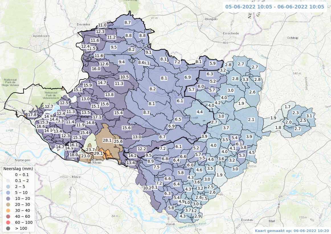 Kaart neerslagmeters van WRIJ (Waterschap Rijn en IJssel). Kaart is trouwens grensoverschrijdend vanwege het stroomgebied van de Oude IJssel, Baakse Beek, etc.
