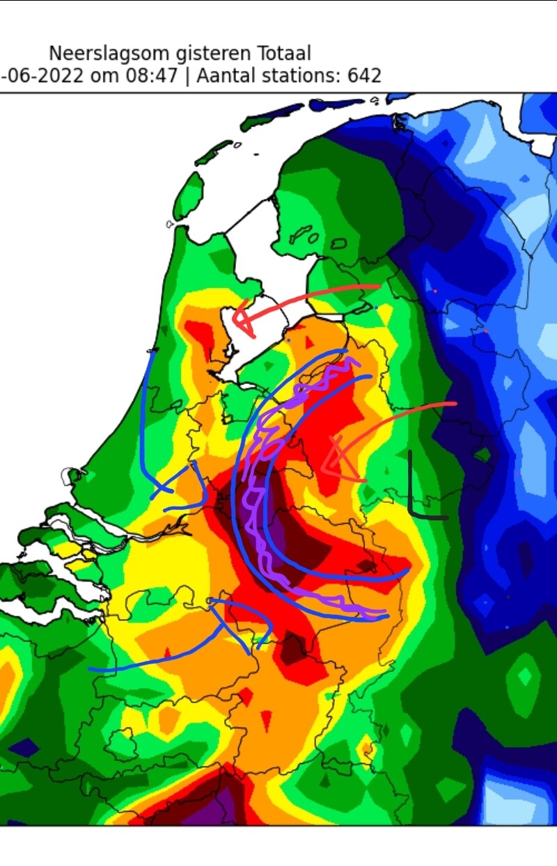 Net aan de westkant van het laagje waar de warme lucht bleef indraaien en geforceerd werd te stijgen vanwege instromen koele lucht aan de zuidwestkant. Lijkt ook enige tijd in NH een IJsselmeereffect te zijn geweest met vooral rond Adam en in de Zaanstreek door ingezaaide buien 30 tot 50mm.