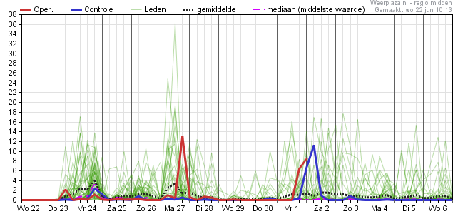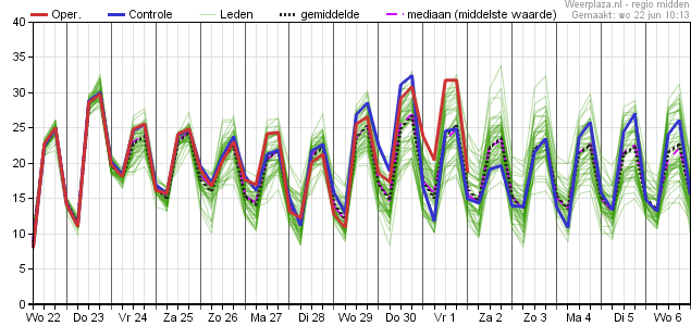 Zoals ik al een paar dagen aangeef, wordt het dipje rond het weekend steeds verder weggewerkt. Inmiddels lijkt het er voorzichtig op dat die dagen ook richting de pakweg 23 graden gaan, waarmee het de komende 10 dagen dus continu 23+ en vaak zelfs 25 graden wordt in midden NL. In het zuid(oost)en is dat continu 25 graden of meer. Zomer dus!