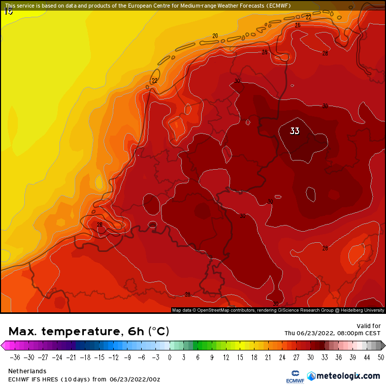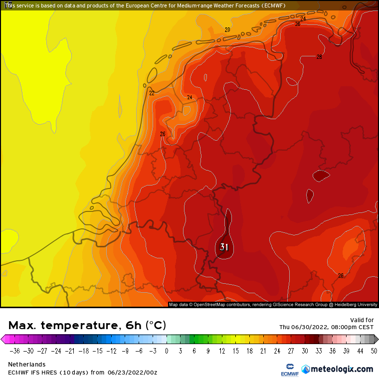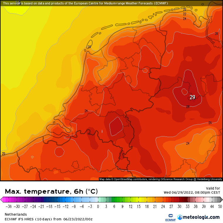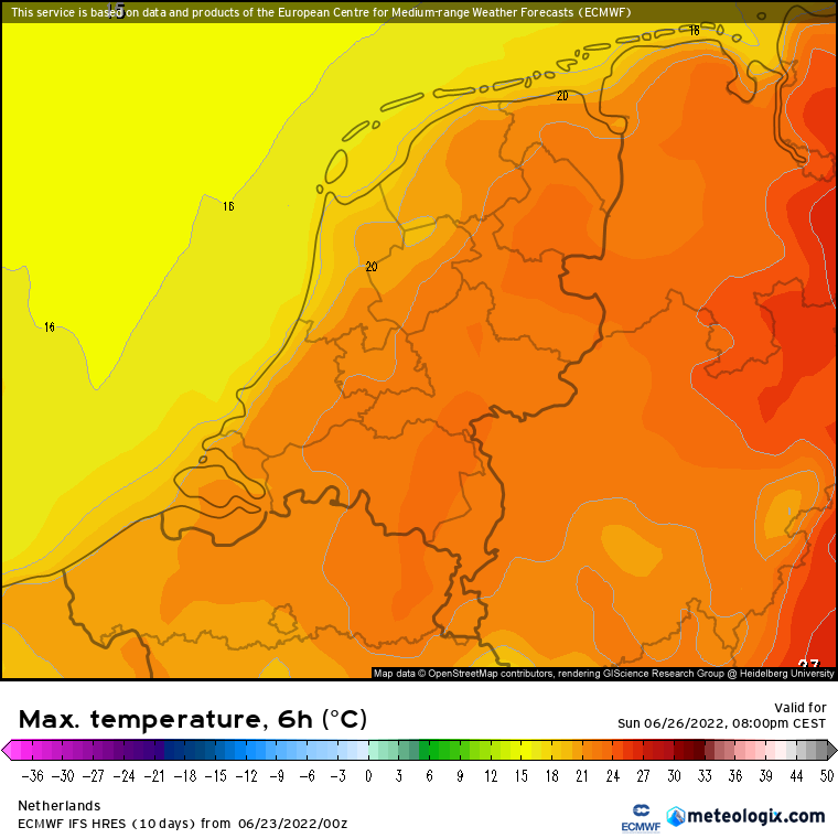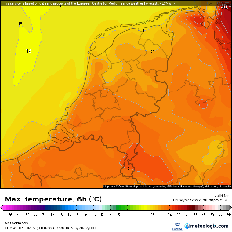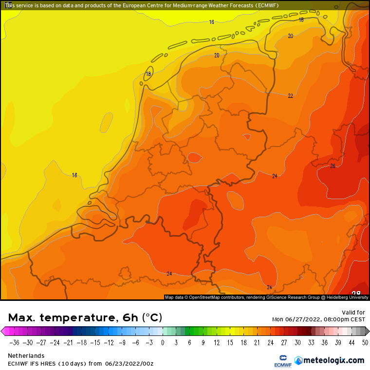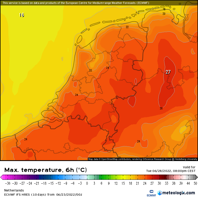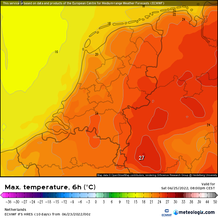 Telkens ruim boven de 20 graden, landinwaarts zelfs regelmatig 25+ graden. Wel regelmatig kans op onweersbuien.