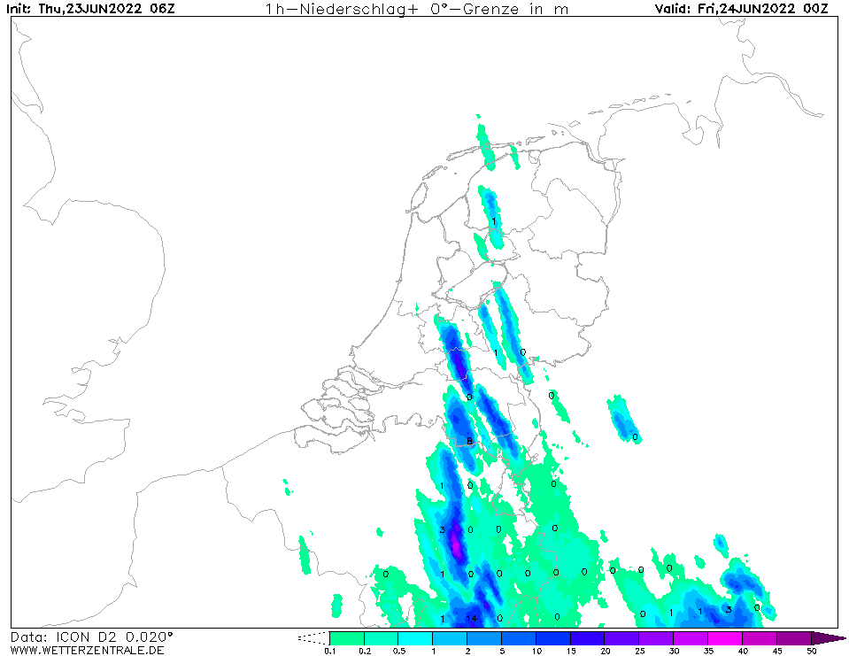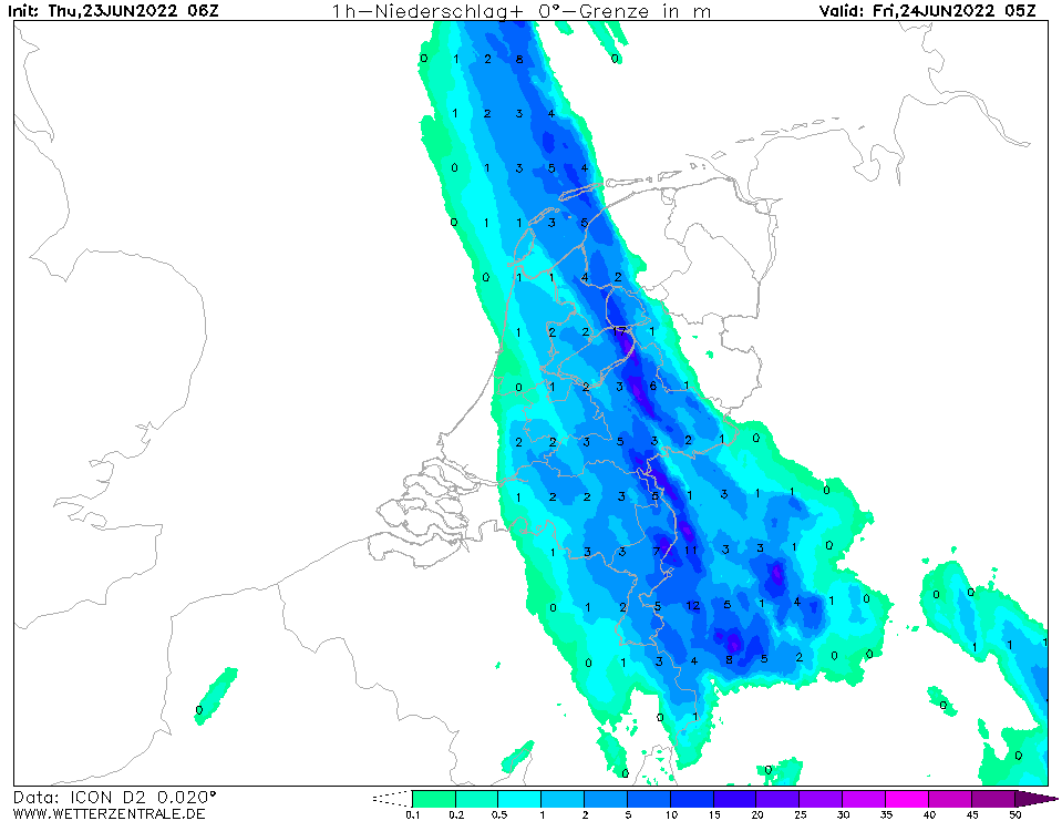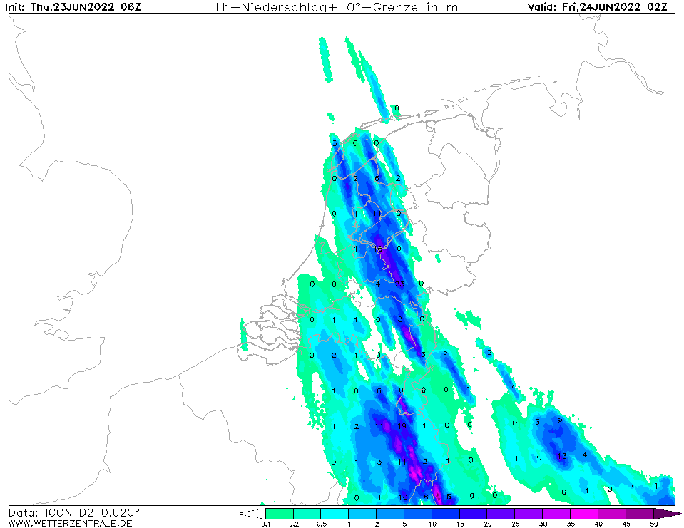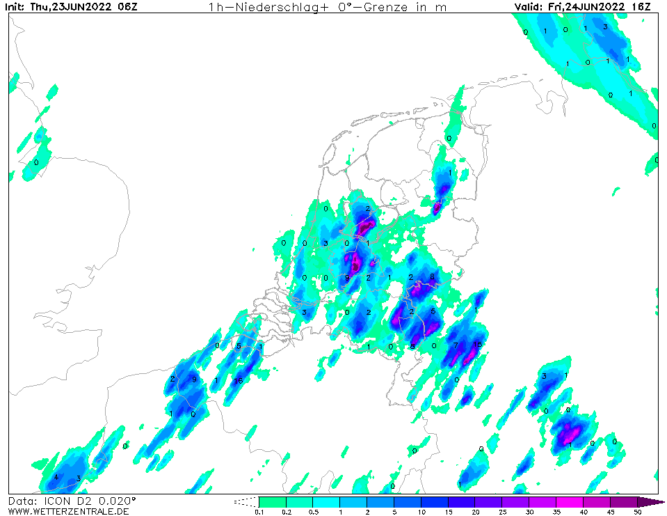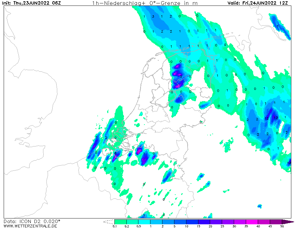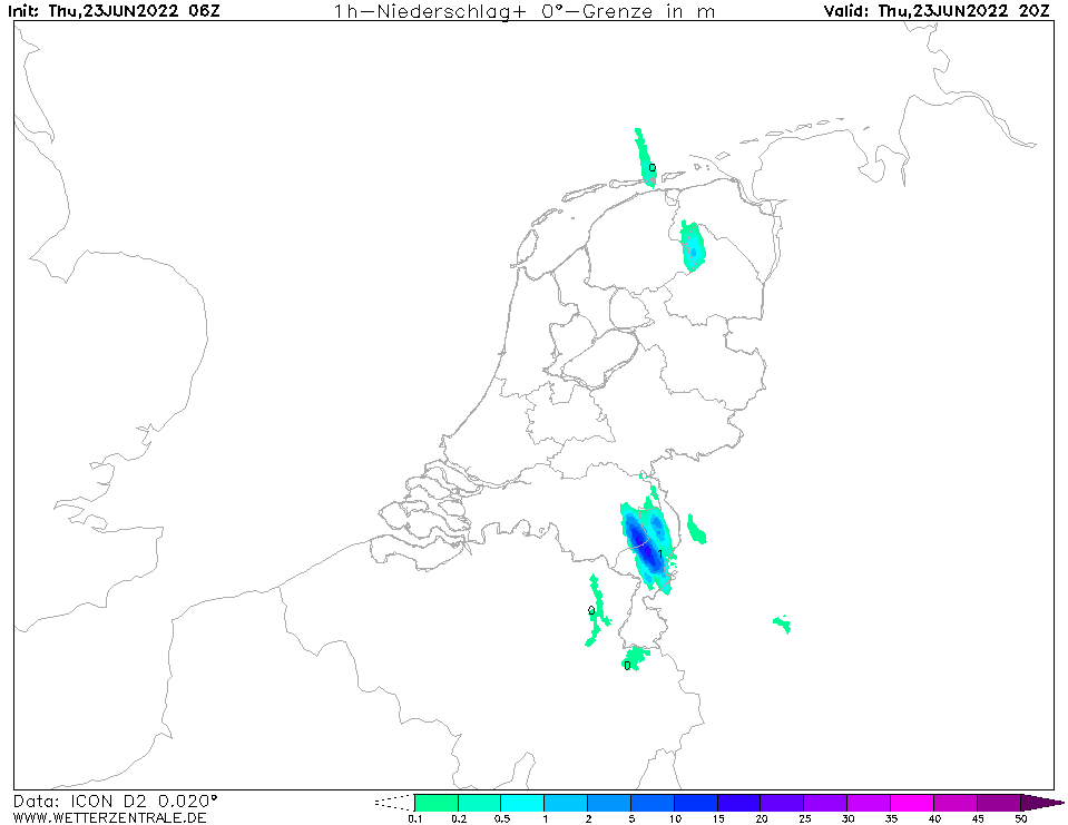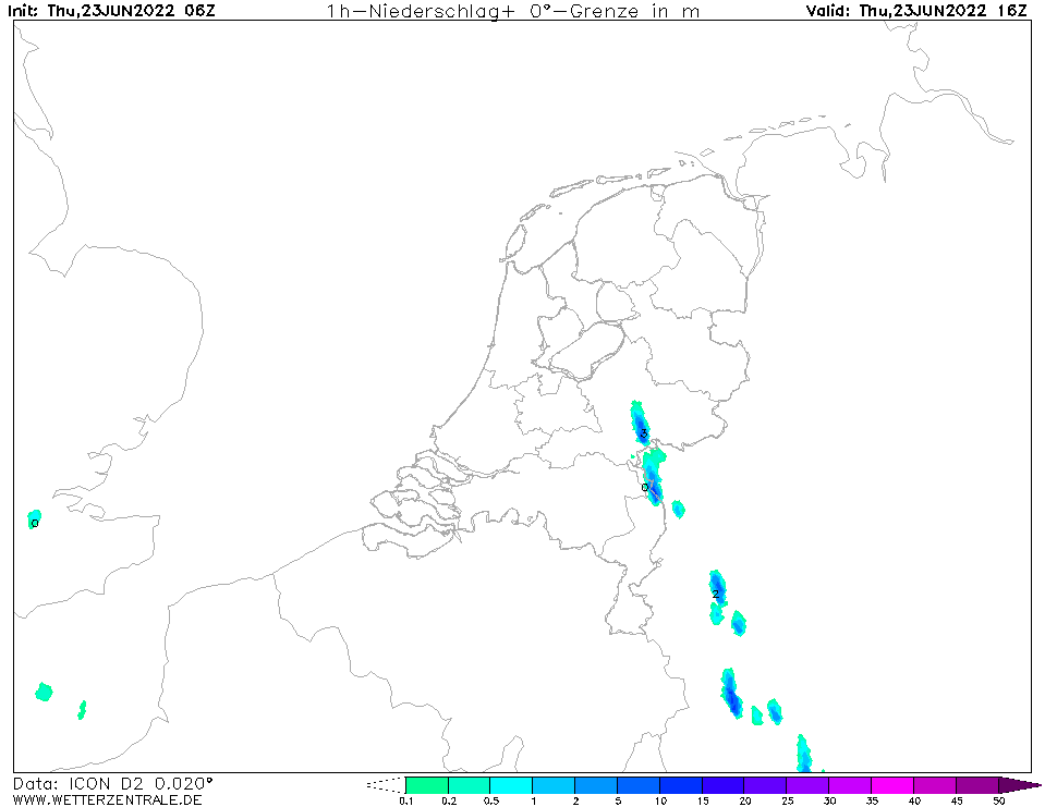 De komende 40 uur beloven interessante uren te worden qua neerslag, al zal er nu de eerste paar uren nog weinig gebeuren. Einde van de middag of begin van de avond lijkt het te beginnen, met een paar korte, kleine buitjes in omgeving Doetinchem (ook Harmonie en de vorige Icon run lieten deze locatie zien). Deze buien zetten echter niet door (tekst gaat onder de afbeeldingen verder).