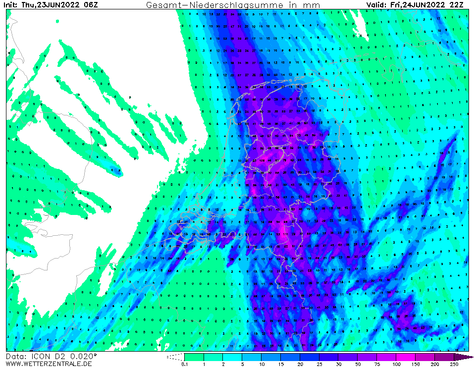 Uiteindelijk berekent ICON de totale neerslagsommen zoals in onderstaande afbeelding. Uiteraard zullen exacte locaties en hoeveelheden nog gaan veranderen, maar met meerdere plekken boven de 100 mm geeft deze reeks kaarten wel de potentie aan.
