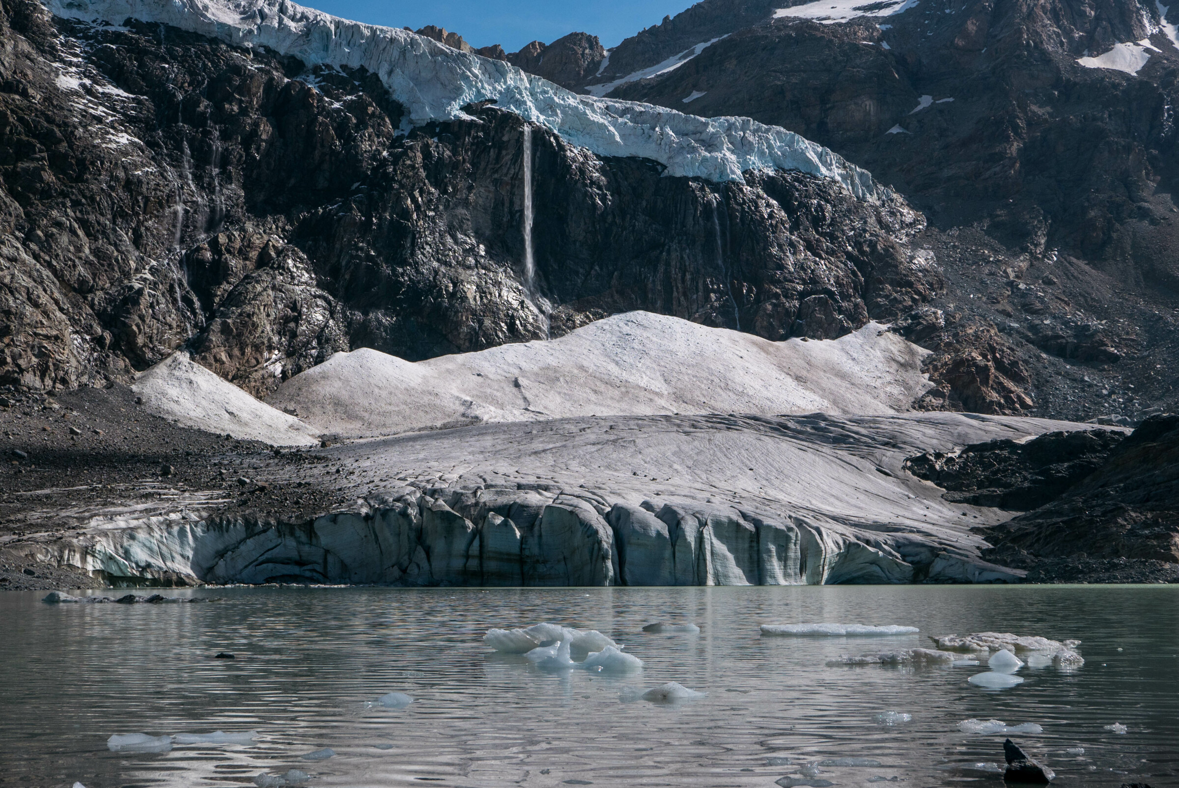 Ja, dat was ook niet de bedoeling. Ik zag het ook letterlijk niet aankomen doordat ik al een paar uur in de wolken liep. Gelukkig kon ik de tent nog snel eningszins beschut opzetten. En uiteindelijk was het het allemaal waard, want ik wandelde naar onderstaande mooie gletsjer toe (waarover een volgende keer meer).