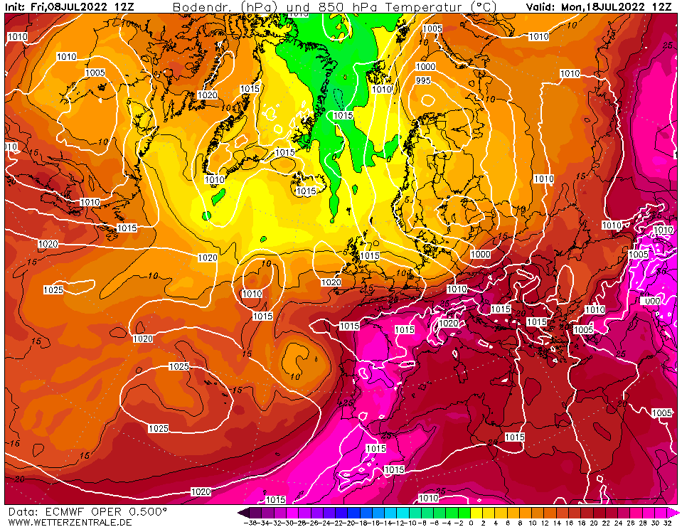 De kaart van 216 uur laat een opmars van (zeer) hoge T850's zien in de Lage Landen, maar onderstaande kaart op 240 uur laat zien dat in dit specifieke scenario een aanlandige aanvoer de zomerhitte weer terugduwt tot grofweg de Belgisch-Nederlandse grens. Deze oper voorziet een enorme, zinderende hittegolf nét ten zuiden van de Benelux waarbij het kwik in steden als Parijs, Straatsburg en Bern de 40 graden zou kunnen halen.