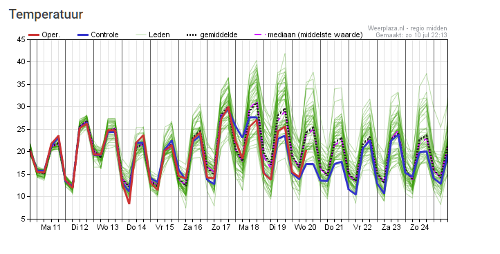 Hitte komt toch ook meer in de pluim. In het zuidwesten zelfs drie dagen kans op 35+, maar ook nog best wat spreiding.