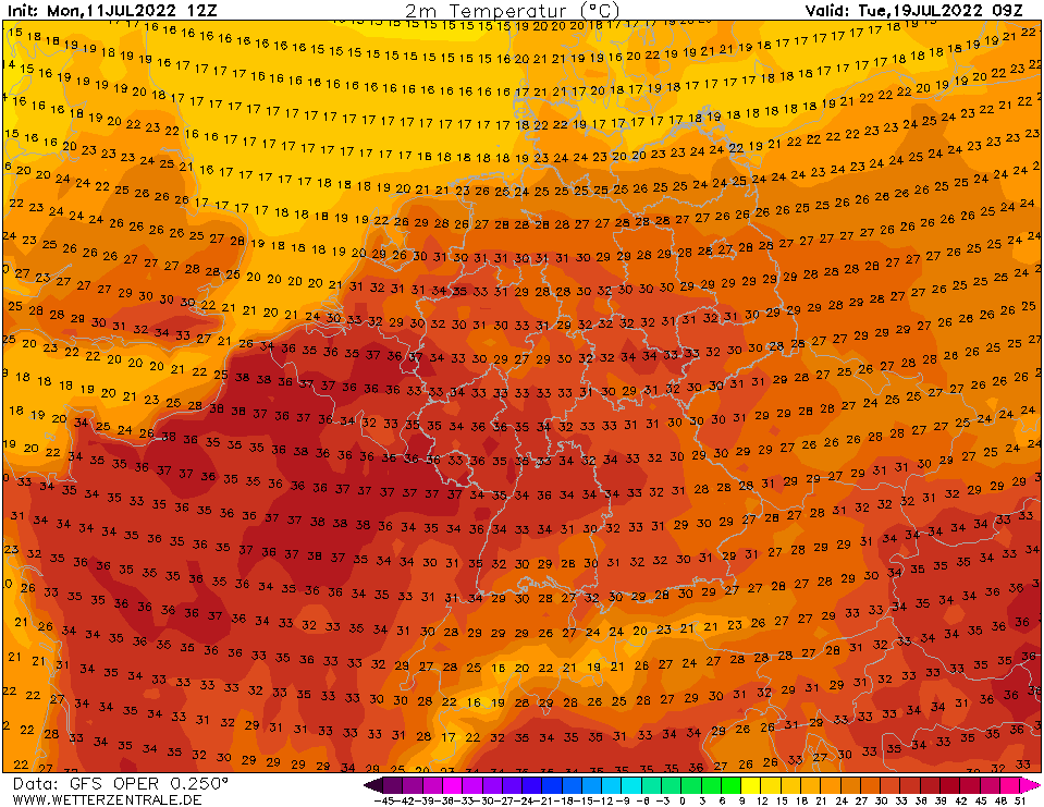 Het lijkt me stug als het om 11 uur 's ochtends al 37 graden kan zijn. Ik denk dat er onjuiste parameters gebruikt worden door GFS. Er is iets in ieder geval niet geloofwaardig aan GFS.