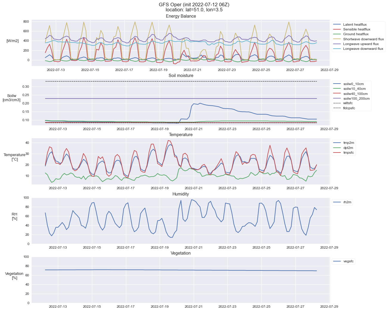 Het is een aanname, maar ik durf er wel wat geld op te zetten, dat het percentage vegetatie (in de gridcell) dat GFS gebruikt niet actueel is, maar een "klimatologische" waarde. En ze zullen waarschijnlijke ook wel één of meerdere van die waarden hebben voor de "intensiteit" van de vegetatie (iets als leaf-area-index), maar dat wordt niet ontsloten.