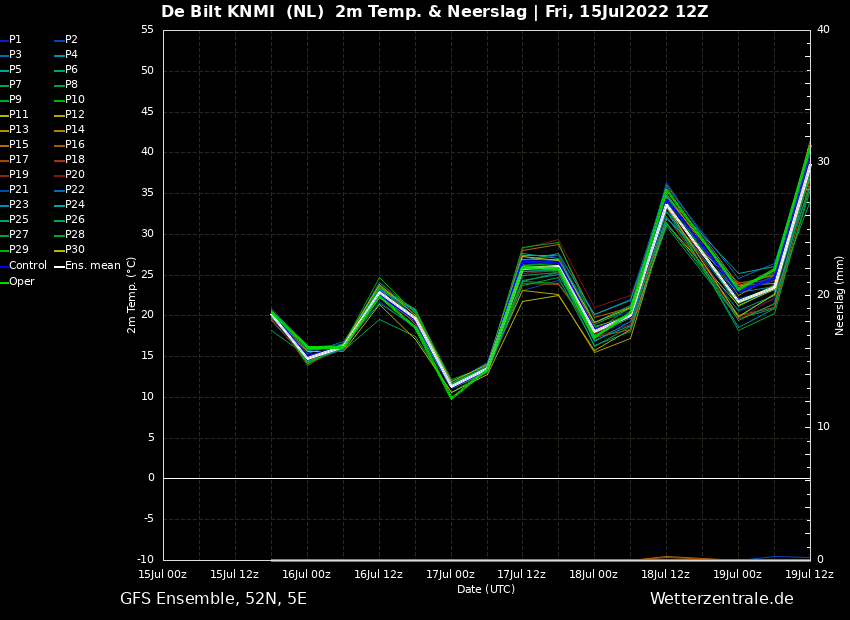 Voor De Bilt komt het gemiddelde tot 38,6°C. De operationele run ligt keurig op het gemiddelde.