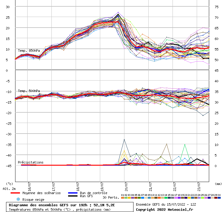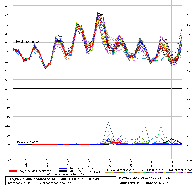 Ensemble GFS1512 (t/m +192) - De Bilt: droog, Tg: 38°C | Tg850: 22,5°C