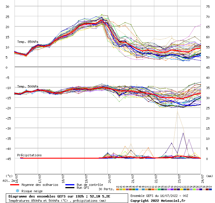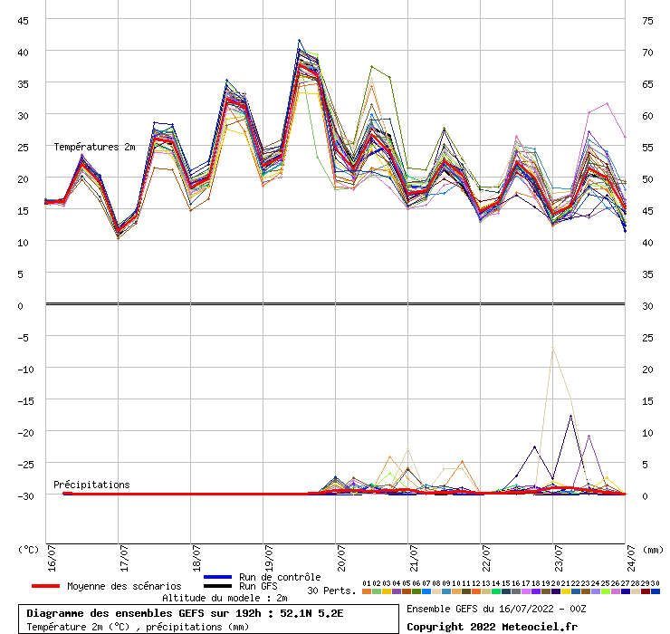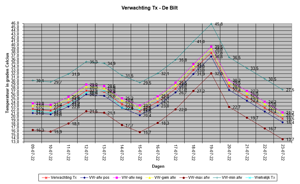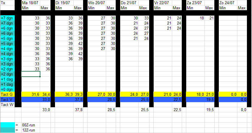 Voor dinsdag staat er voor De Bilt nu een gemiddelde DMO van 37,8°C waarmee de meest waarschijnlijke Tx dan uit komt op 38,8°C