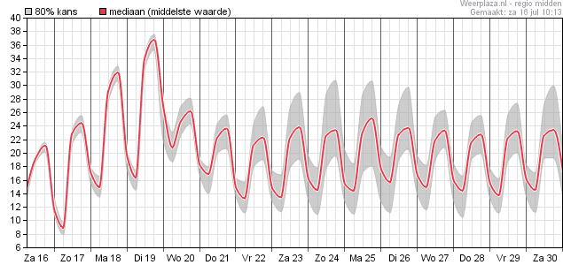 De mediaan voor regio midden zit nu rond de 37°C