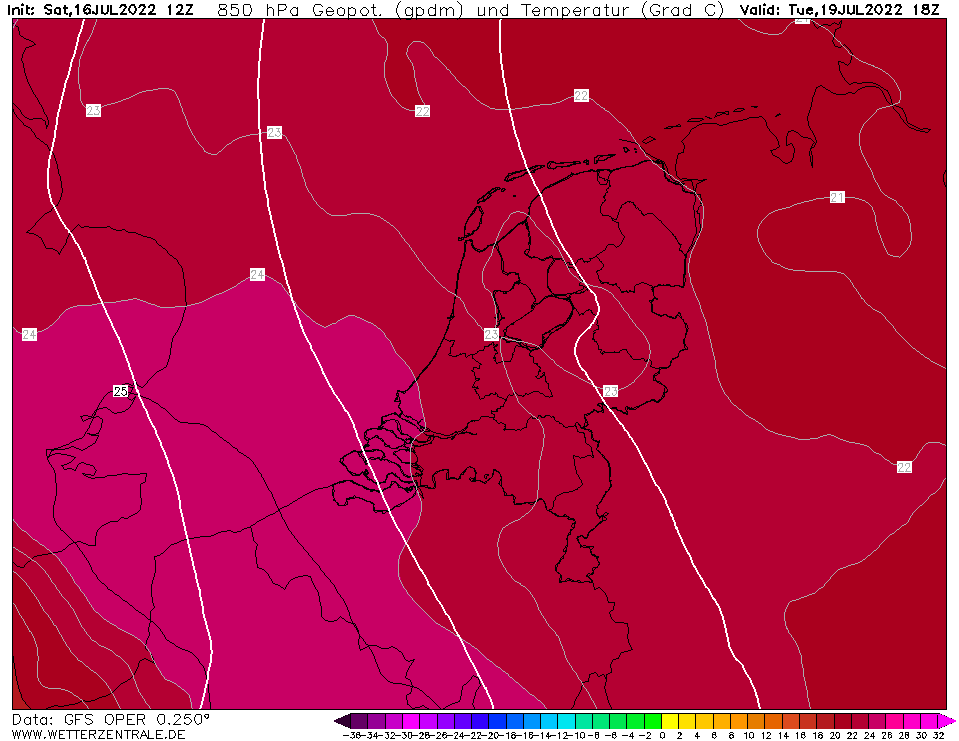 Bedankt Ben. Ik ben benieuwd of we dan die 40 gaan halen in zuidwest NL. Want GFS die 1 van de warmste berekeningen is voor dinsdag, komt veelal met temps van 23 graden op 850hpa, alleen in het zuidwesten hoger. Daarnaast is de ligging van Nederland een stuk noordelijker en is de hoogte plus bodemsamenstelling natuurlijk heel anders dan Spanje. Dus het is dan ook nog maar de vraag, dat mocht de 25 gr op 850hpa worden gehaald in het zuidwesten, of we dan de 40 daar gaan halen. Wel blijft de wind denk ik lang genoeg afhandig en als het met Spanje met die waarde al boven de 40 komt, zou er toch een kleine kansje moeten zijn voor het zuidwsten? Spannend hoor. Ik ben ook benieuwd waar EC mee komt