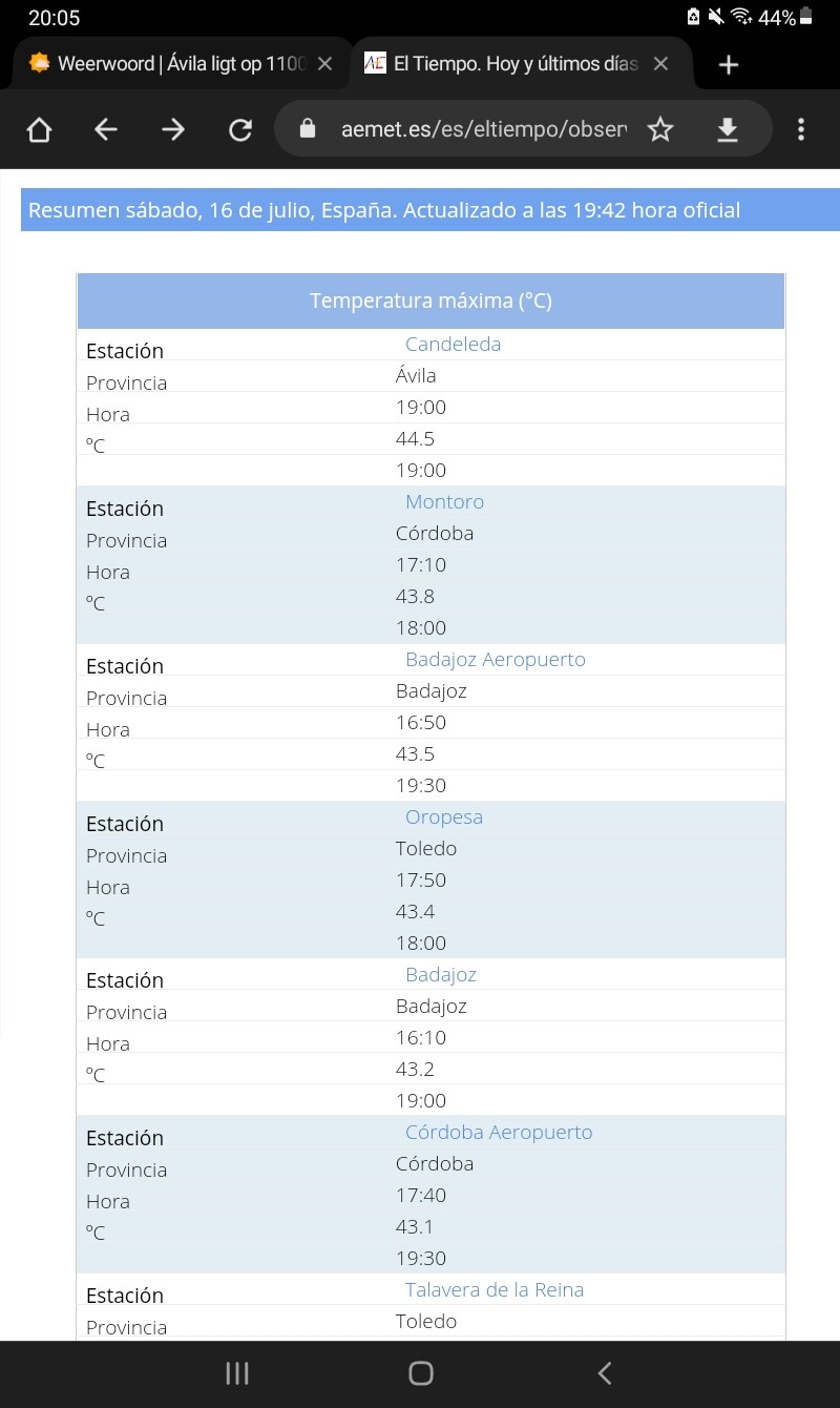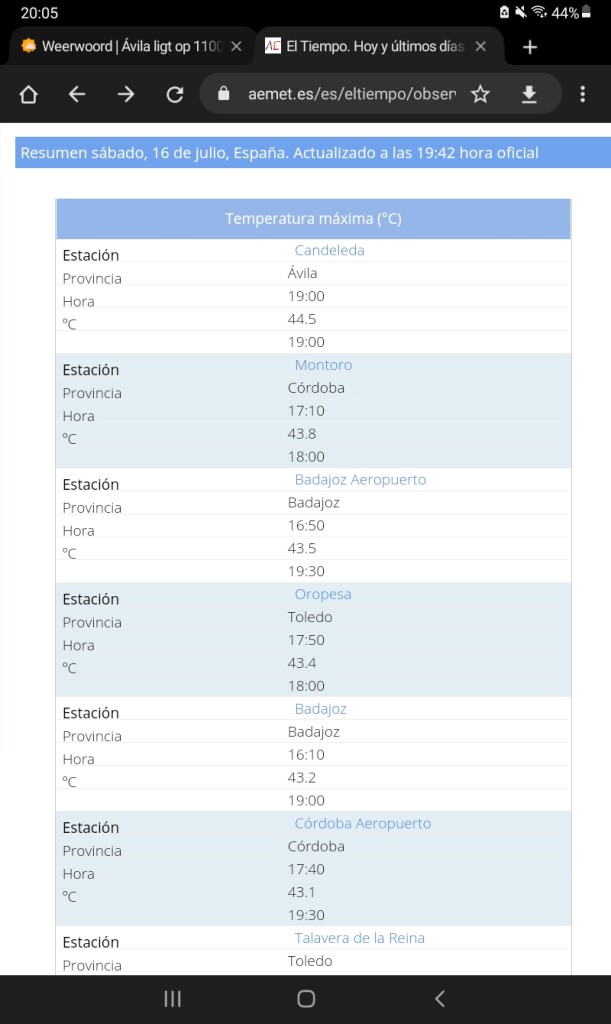 Dus niet de plaats zelf. Dit is het lijstje met hoogste maxima. Tijdstip is wel afwijkend. Tweede scoorde 43.8. Bron is het Spaanse KNMI (AEMET).