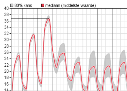 Alles overziend zet ik in op 40-41 in zuidwesten + België. EC-average heeft 38-39 voor ZW en met 1-2 graden onderschatting haal je die 40 gewoon. De Bilt record maakt ook grote kans te sneuvelen. Gridpunt Harderwijk heeft een gemiddelde in EC van bijna 37. Record DB is 37,5........