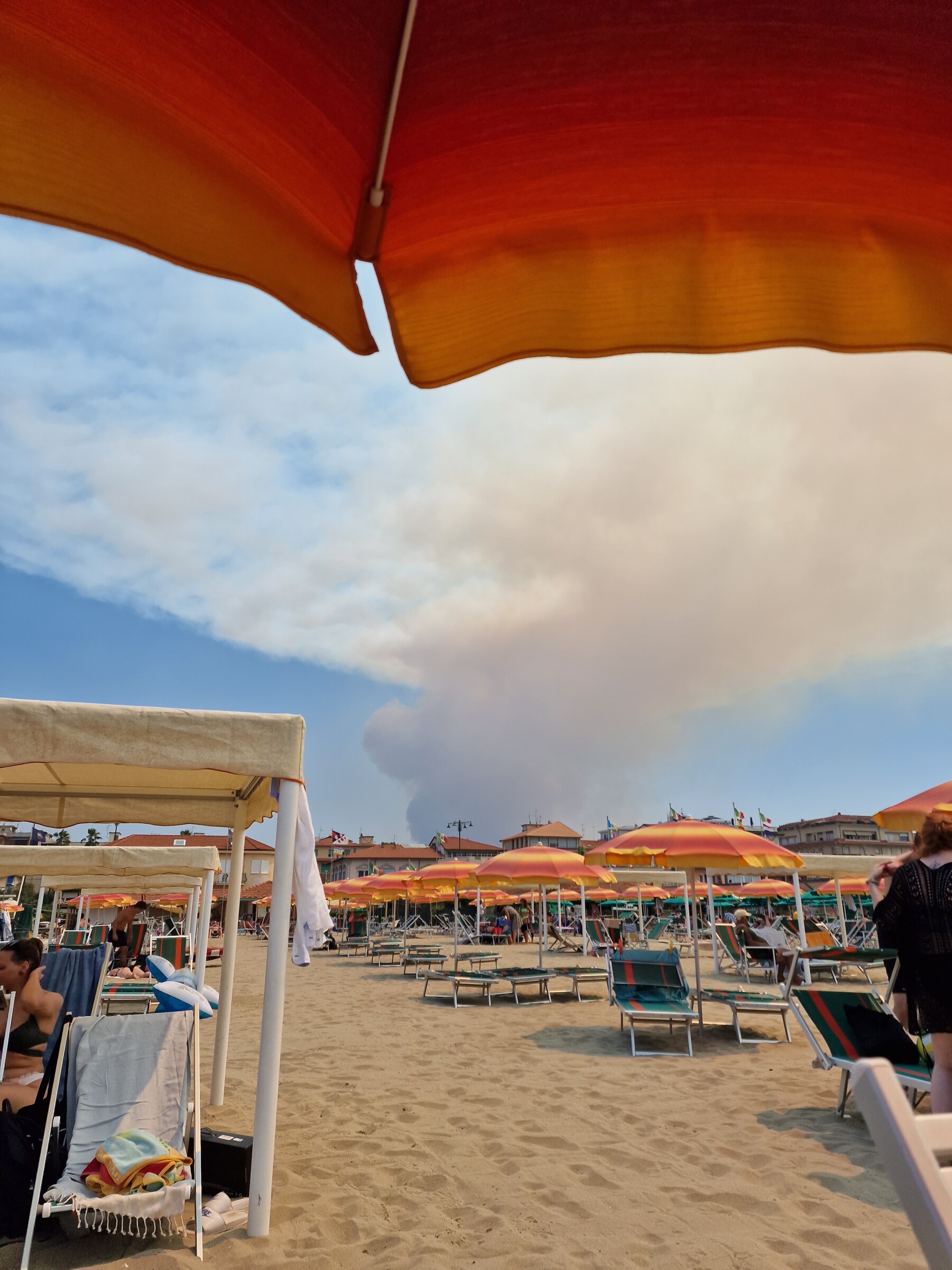 Autosnelweg naar Lucca afgesloten. Daar reden we gisteren nog. Vaag zonnetje hier in Viareggio door rookpluim. Blusvoertuigen duiken hier voor de kust met buik het water in en vliegen weer naar de brand. Inmiddels dalen hier ook asdeeltjes neer.