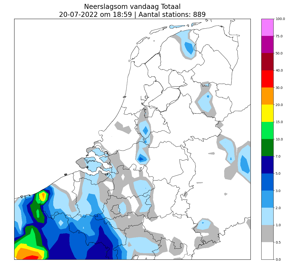 Verder is ook de buienlijn van vanmiddag over het midden te zien en de onweersbuitjes in het (noord)oosten.